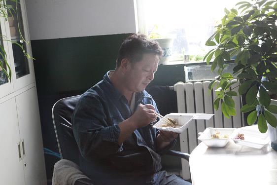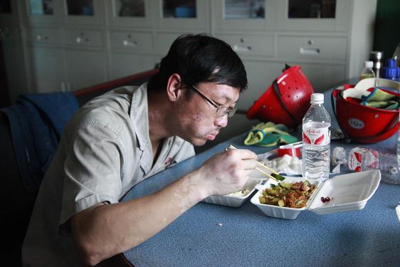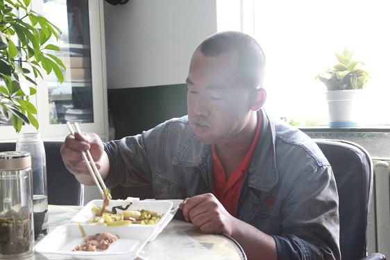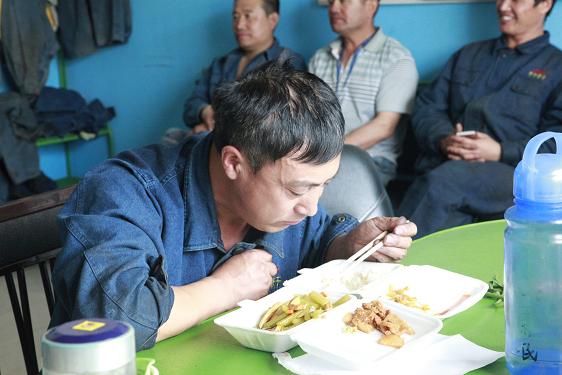西紅柿炒雞蛋、燒茄子、土豆塊……不定時(shí)地還有魚、雞腿、紅燒肉等等。飯菜雖簡(jiǎn)單,但對(duì)于忙碌了一個(gè)早上的他們來(lái)說(shuō),卻非常美味,吃起來(lái)一副狼吞虎咽的樣子。此刻,也許山珍海味,也許滿漢全席,都略顯的失色。